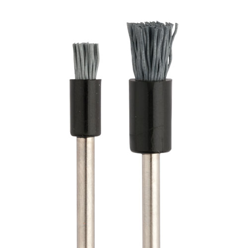 Los cepillos de nylon tipo brocha están hechos con hebras de 0.018 pulgadas de carburo de silicio grano 500. Su virola de una sola pieza se asegura de que la herramienta no se separe. Las virolas de plástico previenen las rayaduras cuando se utilizan para trabajos de pulido interiores.